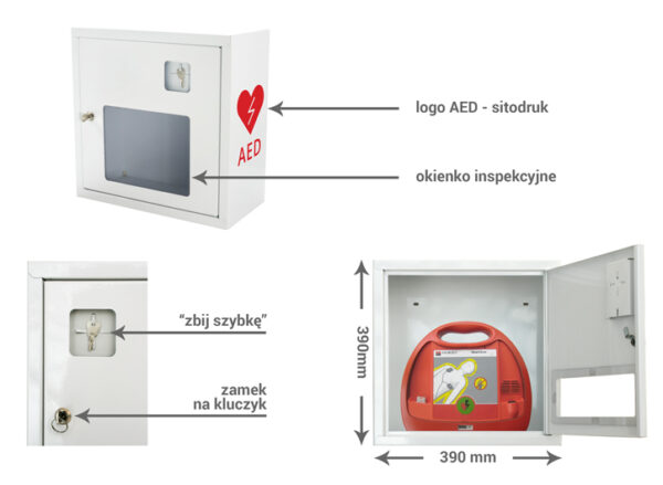 Szafka na AED ASB Key-lock White, Red oferowana to solidne rozwiązanie do przechowywania defibrylatorów AED. Wykonana z białej blachy stalowej malowanej proszkowo, wyposażona jest w zamek kluczowy, co zapewnia dodatkowe bezpieczeństwo dostępu do urządzenia. Drzwi szafki posiadają okienko inspekcyjne wykonane z PLEX, które umożliwia łatwą kontrolę zawartości bez konieczności otwierania szafki. Na drzwiach znajduje się nadruk logo AED w kolorze czerwonym wykonany techniką sitodruku. Wymiary szafki wynoszą 37 x 37 x 17 cm